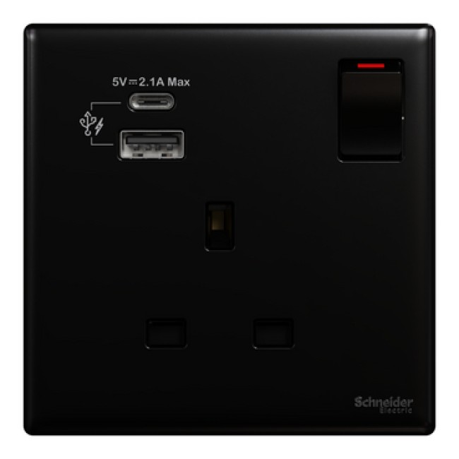 Schneider Electric Vivace E 13A Switched Socket with USB A+C 2.1A 250V 1 Gang Black